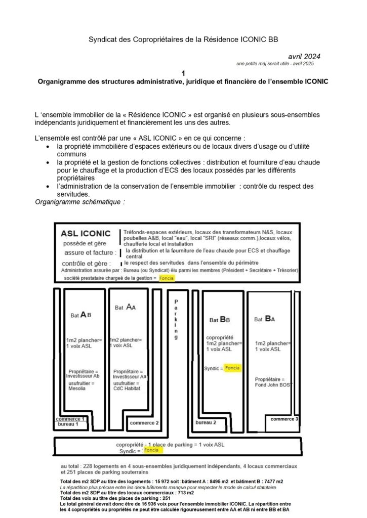 Malheureusement, la répartition des Surfaces de Plancher (indicateur pourtant communiqué aux services fiscaux par le constructeur pour établir l’assiette fiscale foncière) n’a pas été transmise au rédacteur des statuts et le tableau de répartition n’étant pas disponible en août 2024 lors du premier appel de fonds, un tableau de répartition « original » a été créé sans aucun contrôle. Malgré toute la confiance que l’on peut avoir, même après avoir été amené à réduire de presque 50% les budgets artificiellement surévalués de ICONIC BB, du Parking et de l’ASL elle-même, il faut reconnaître que l’espoir persiste encore que le Bureau de l’ASL puisse avoir connaissance de ce tableau « original » et puisse faire rétablir les dispositions statutaires (qui sont effectivement une base neutre et objectivement équilibrée pour répartir les voix et les charges).
